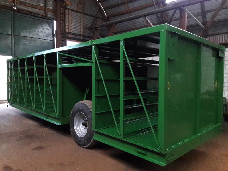 Одноосный тракторный полуприцеп для перевозки ящиков с живой птицей предназначен для перевозки внутри ферм и комплексов ящиков. Пригоден для перевозки в звероводческих хозяйствах мелких животных (норка и др.). Внутренние размеры под направляющие для контейнеров для птицы — по заказу. Увеличение высоты (вместимости) прицепа, доступной под ручную погрузку-выгрузку контейнеров с птицей через устройство гидроподъёма-опускания платформы.