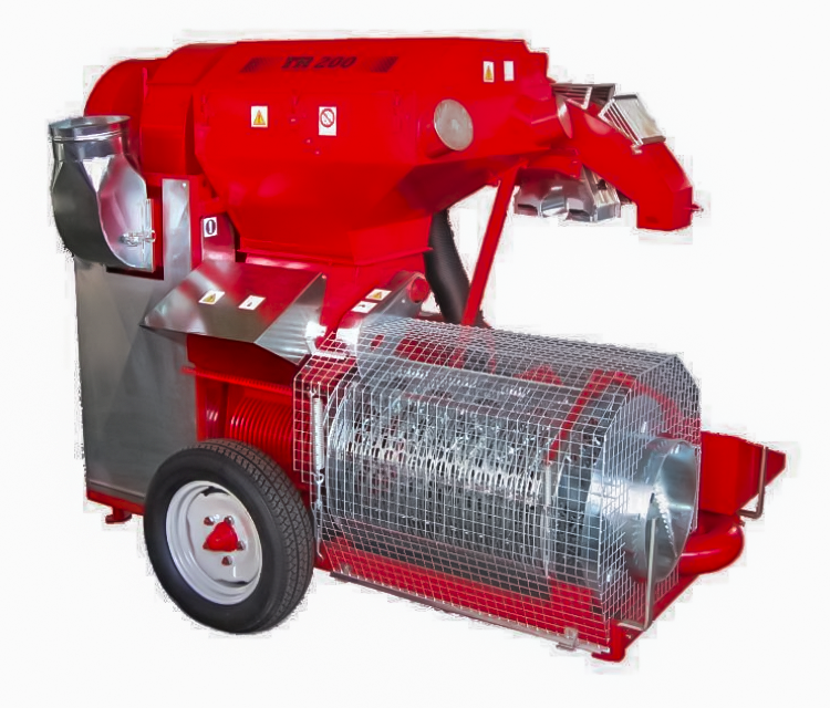 МАШИНА ДЛЯ УБОРКИ ФУНДУКА С СИСТЕМОЙ ВСАСЫВАНИЯ МОДЕЛЬ TR 211 с двумя циклонами для пылеудаления, устройством для третьего мешка, тремя независимыми вентиляторами и четвертым вентилятором для очистки третьего мешка, двойным шкивом с редуктором, шелушителем, двумя шлангами диаметром 120 мм, карданным валом и 25-метровым шлангом для сбора диаметром 120 мм.